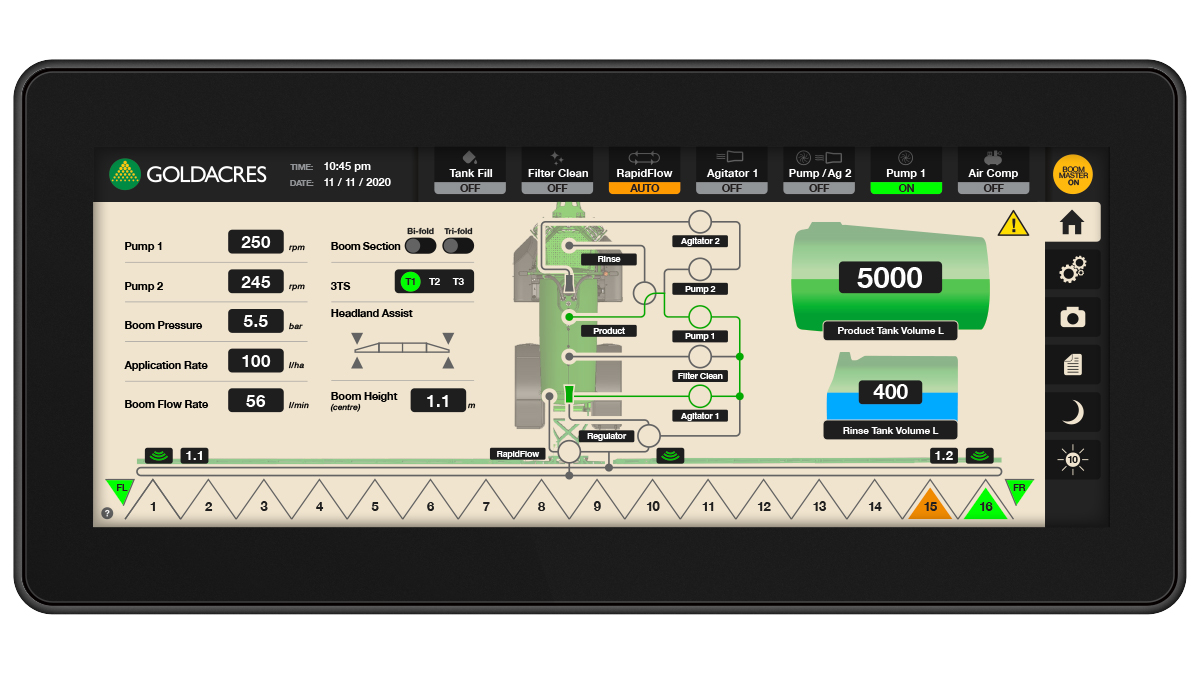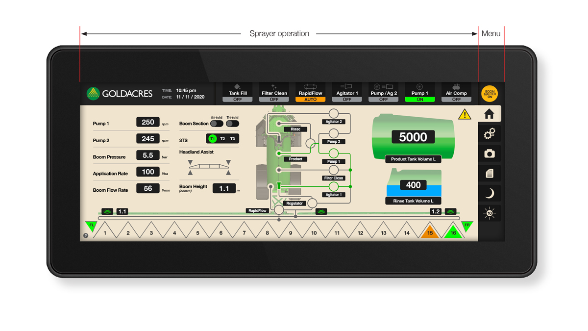 Low profile 12” full-colour touch display allows the user to quickly see and operate all the important sprayer functions. The display provides the perfect aspect ratio to clearly display important information as well as large button areas such as the boom sections where the entire screen width is utilised.