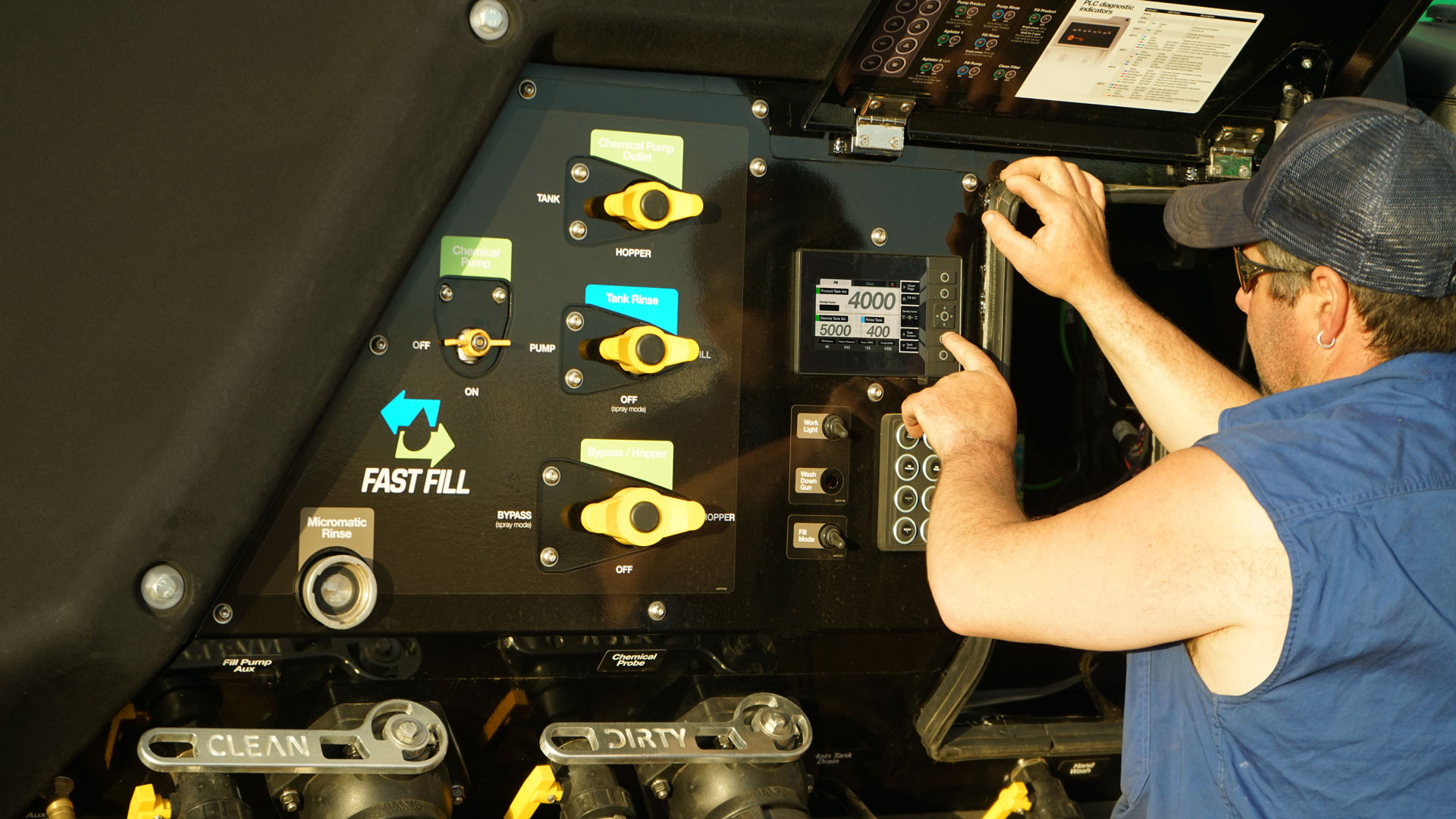 The screen and button panel are mounted next to the storage compartment but under the door for protection when spraying. In addition, the G-Hub system also manages the liquid control valves which operate chemical induction, agitation, and cleaning functions.