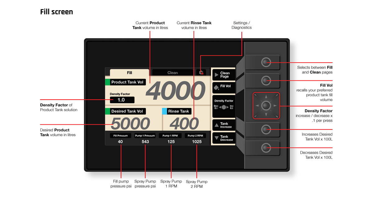 - Extended control of boom plumbing functions including boom prime and filter cleaning modes