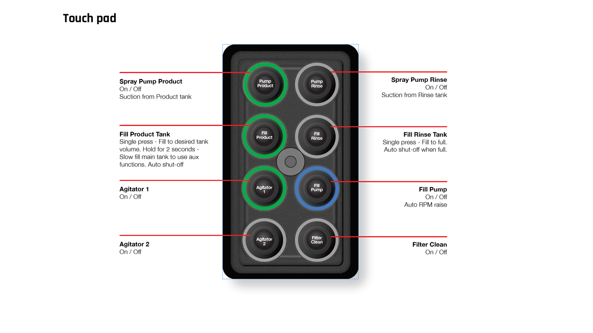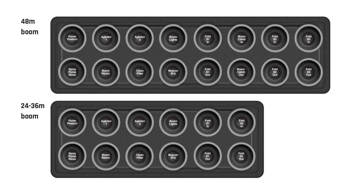 The auxiliary keypad is used to operate many of the sprayer control functions and boom folding activities. Both keypads feature backlighting and operating status. For sprayers not fitted with the optional 12” cabin display, these function lights also provide some level of warnings via flashing or different colour lights.