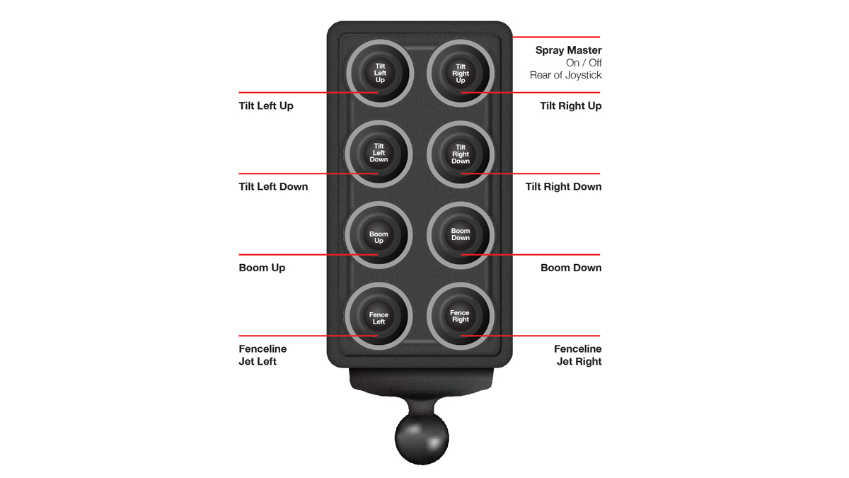 The joystick features a RAM mount® to allow flexible mounting options to the tractor side console. In addition, the 8 button keypad can be removed and remote mounted within the tractor console. As there are so many makes and models of tractors to work with this was felt the best solution to make mounting integration as simple as possible. The joystick will be supplied with a separate universal mounting bracket.